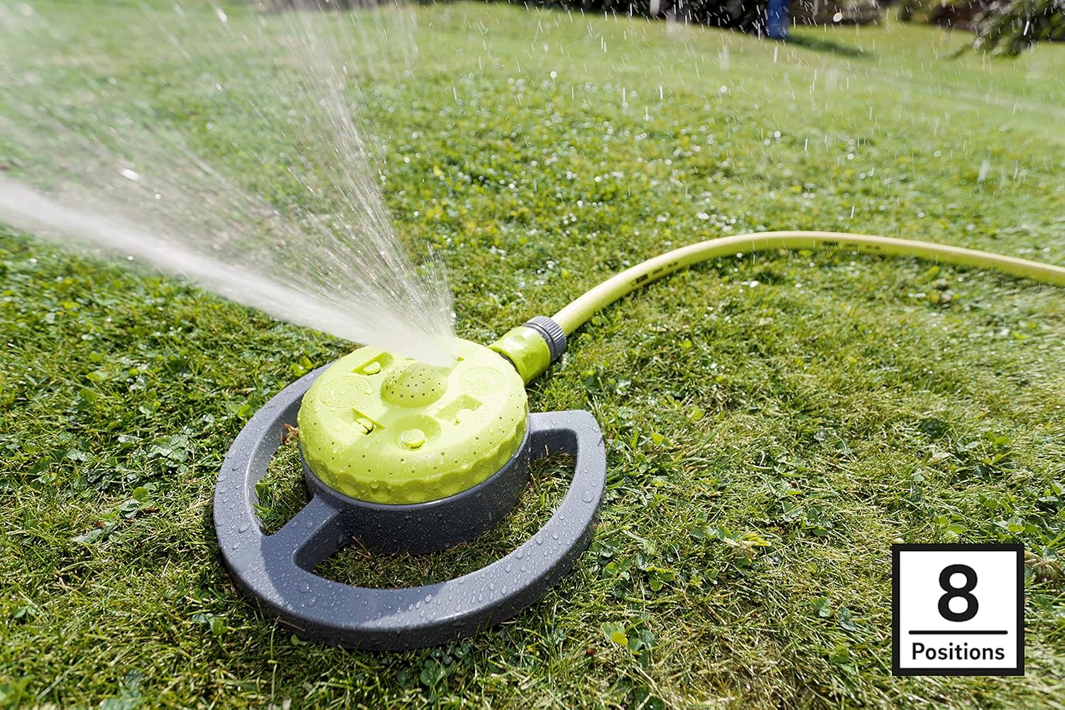 Image: The REHAU 8 Pattern Dial Sprinkler actively watering a lawn, demonstrating one of its spray patterns. The image highlights the sprinkler's compact design and effective water distribution.