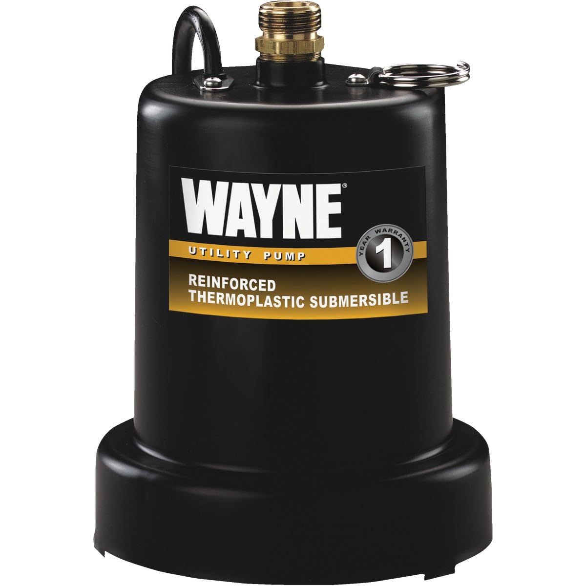Image: The WAYNE TSC130 Submersible Multi-Use Pump, a compact black unit with a brass discharge adapter at the top and a handle for portability.