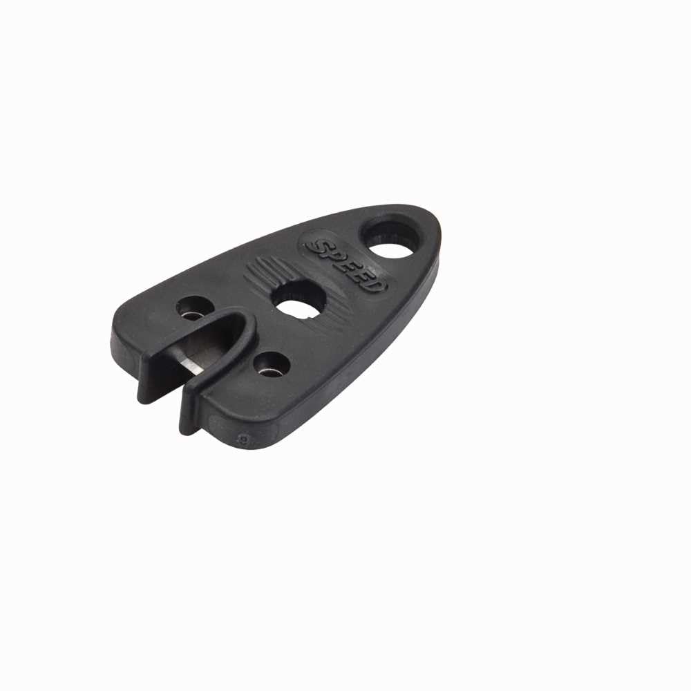 Figura 1: The Oregon 21-000 Trimmer Line Cutter. This image displays the compact, black plastic tool with a recessed blade for cutting trimmer line and multiple holes for potential attachment.