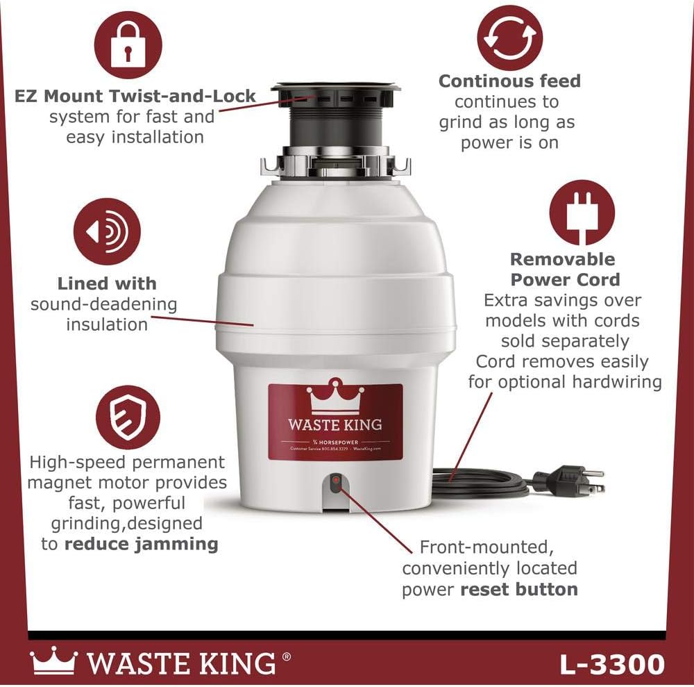 The Waste King L-3300 is a 3/4 horsepower garbage disposal designed for efficient and reliable food waste disposal. It features a pre-installed power cord for easy setup and sound insulation for quieter operation. Its permanent magnet motor and stainless steel swivel impellers are engineered to reduce jamming, ensuring continuous feed technology for smooth performance. The unit includes a removable splashguard for convenient cleaning and a front-mounted reset button for easy access.