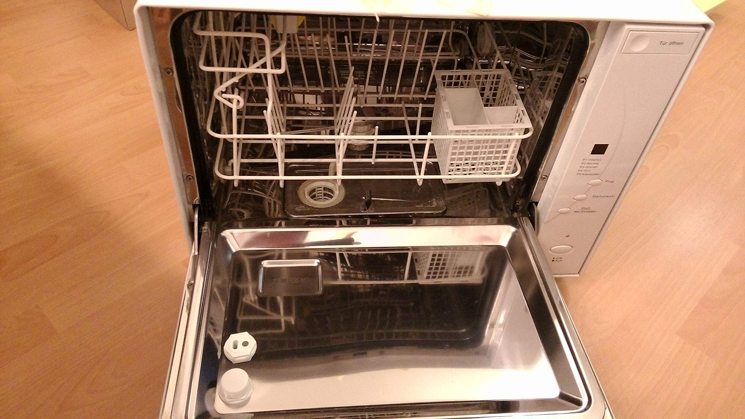 - Posicionament: Place the dishwasher on a stable, level countertop. Ensure it is located near a water supply, a suitable drain, and a grounded electrical outlet. Allow adequate space around the unit for ventilation.