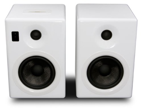 Image: The Kanto iPair 5 speaker system, featuring two white, glossy speakers. The left speaker includes the iPod/iPhone docking station on top and control buttons on the front panel. Both speakers have a tweeter and a larger woofer/subwoofer driver.