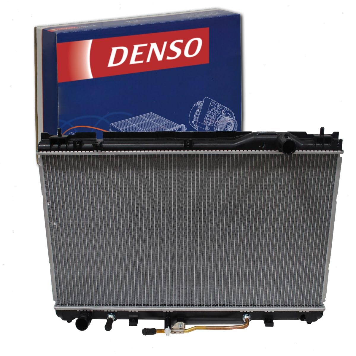 Image 1.1: The Denso 221-0503 Radiator, showcasing its core and connection points, with the Denso product packaging visible in the background.