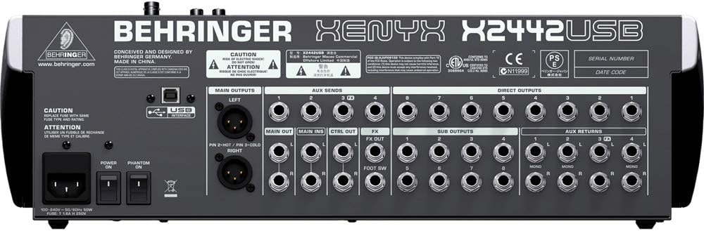 Figura 2.1: Rear panel of the Behringer XENYX X2442USB mixer, highlighting the power input, main outputs (XLR), aux sends, direct outputs, sub outputs, and aux returns. This view is crucial for understanding how to connect external audio devices and power the unit.