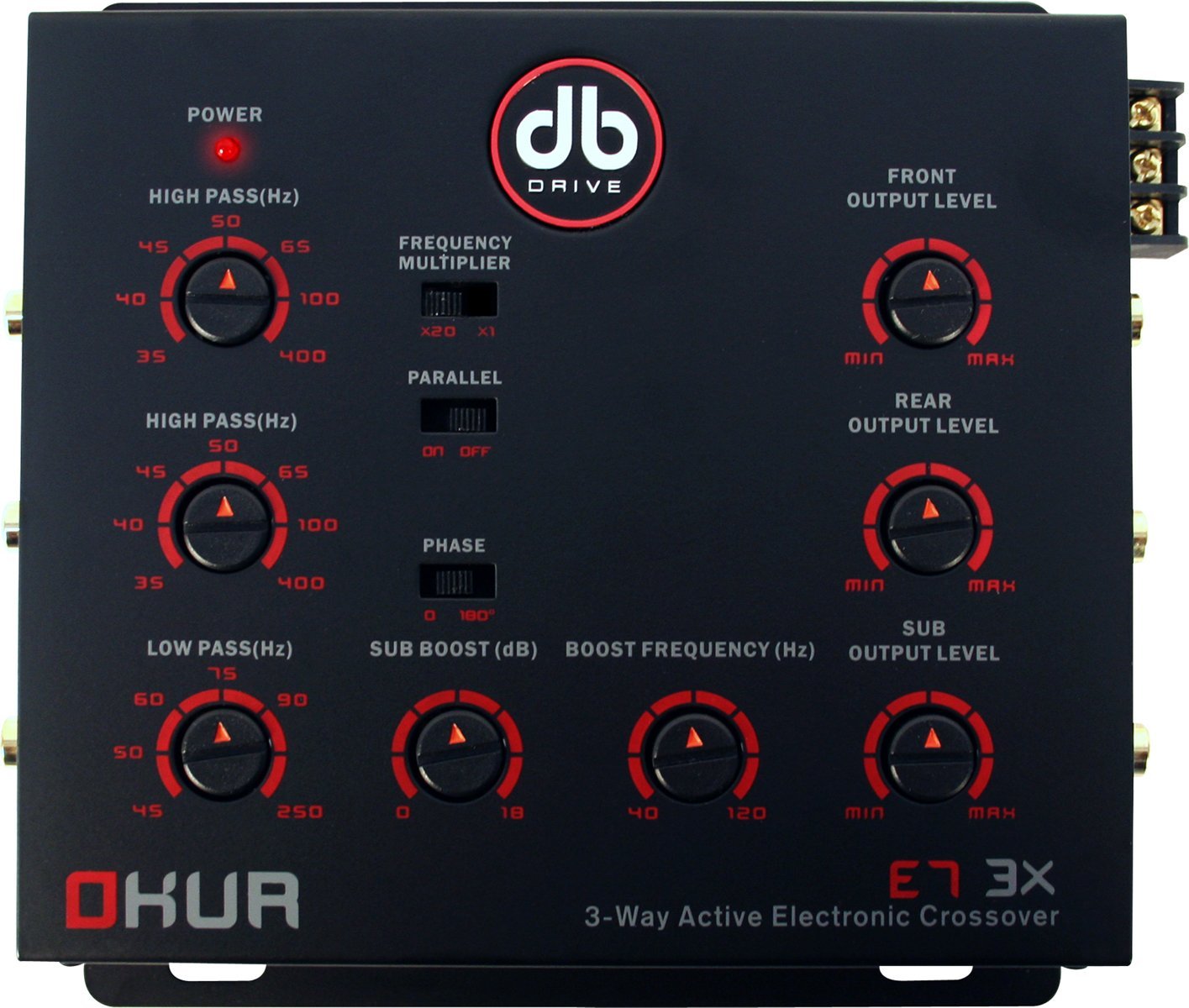 The DB DRIVE E7 3X is a 3-Way Active Electronic Crossover designed to optimize audio signal distribution in a car audio system. It features 2 stereo inputs with parallel input options and 3 stereo outputs, providing precise control over frequency ranges for different speakers.