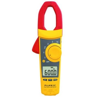 An image of the Fluke 337A True RMS AC/DC Digital Clamp Meter, showing its yellow body, red clamp jaws, rotary dial, and digital display. The display shows "600.0 AC".
