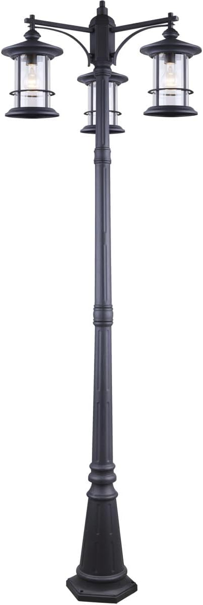 The Canarm IOL156BK Treehouse 3-Light Outdoor Post-Light is designed to add welcoming illumination and character to the exterior of your home. This post lamp features a transitional style with a black finish and clear glass, suitable for various outdoor settings. It requires three 100W Type A bulbs (not included).