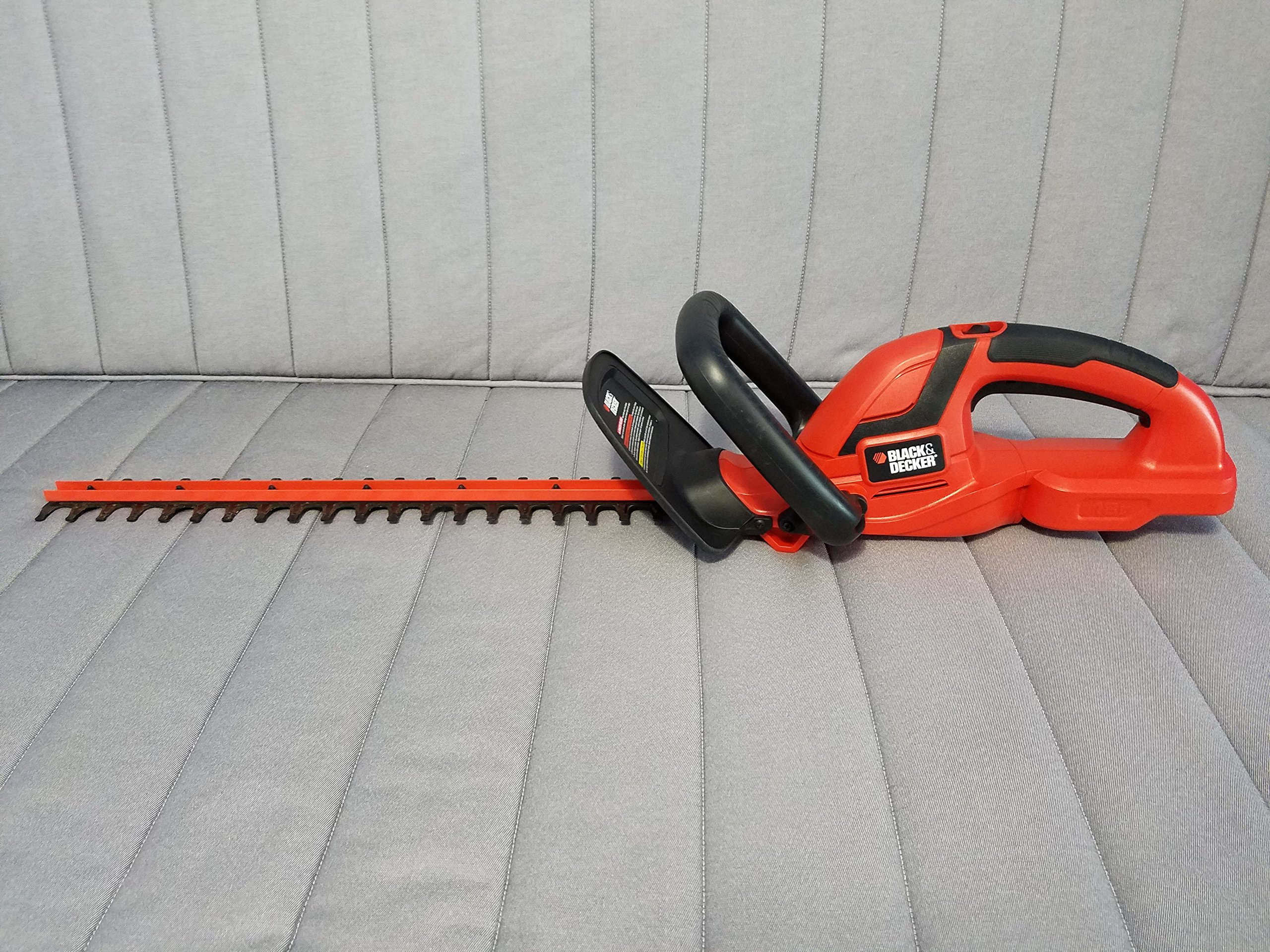 Figure 2.1: BLACK+DECKER NHT2218 Cordless Hedge Trimmer. This image shows the complete hedge trimmer unit, highlighting its ergonomic design and blade length.