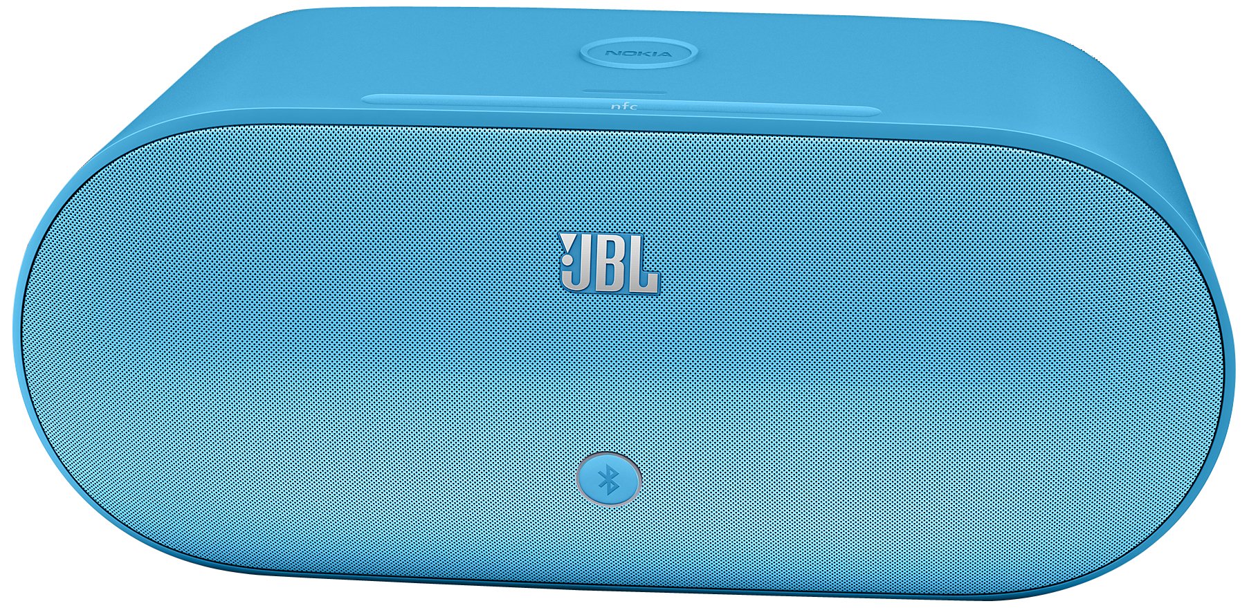 Image: Nokia MD-100W JBL PowerUp Wireless Charging Speaker in Cyan. This image displays the speaker unit with its distinctive design and the wireless charging pad on top.