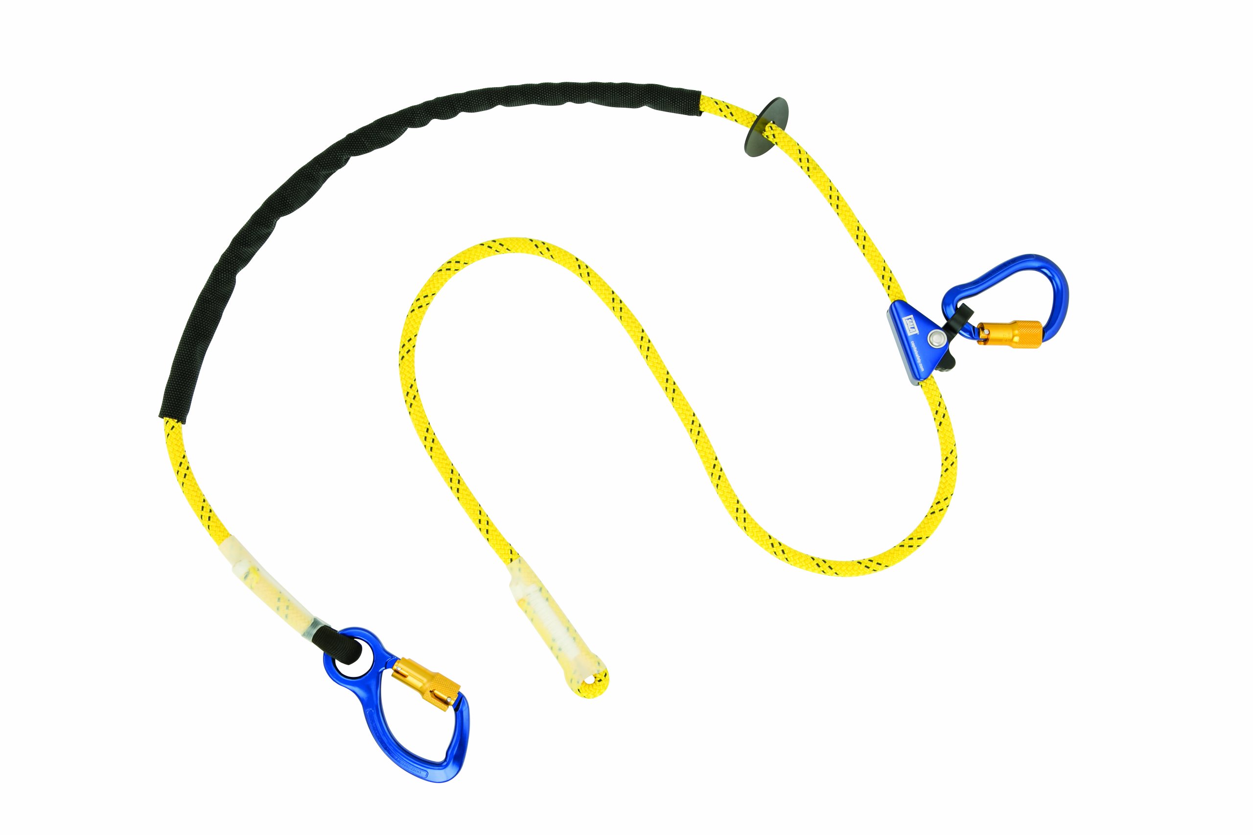 Figure 1: 3M DBI-SALA 1234080 Adjustable Rope Positioning Strap. This image shows the yellow and black rope strap with aluminum carabiners at both ends and a rope adjuster mechanism.