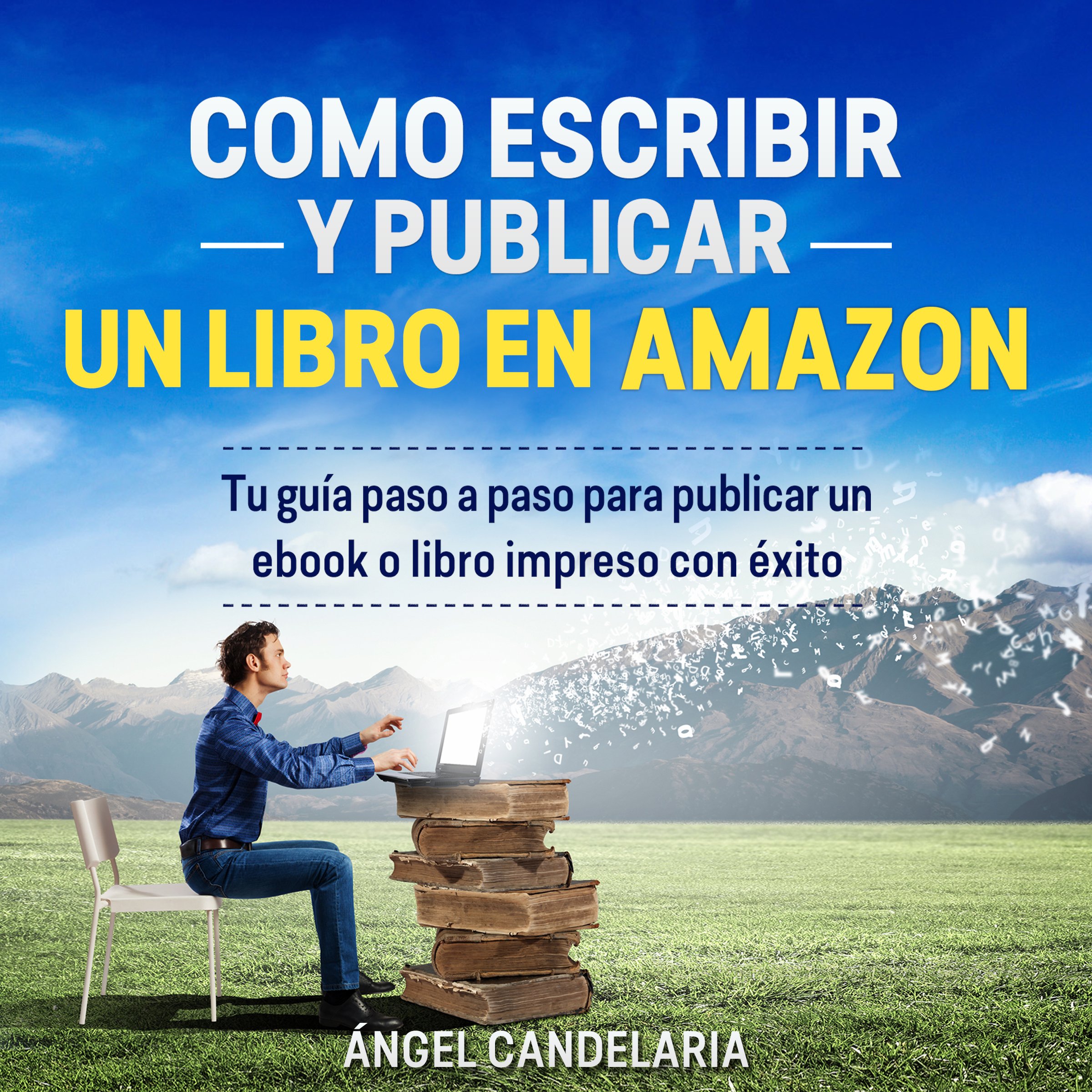 Image: The cover of the "How to Write and Publish a Book on Amazon" guide. It depicts a person seated on a chair, typing on a laptop placed atop a stack of vintage books, set against a scenic backdrop of green fields and distant mountains under a blue sky. The title text is prominently displayed.