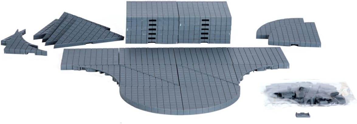- 32 individual grey modular road and plaza sections. These pieces vary in shape, including straight, curved, corner, and ramp sections, allowing for diverse layout configurations.
