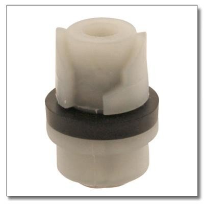 Figura 1: Image of the Robot Coupe 105268 Drive HUB. This component is primarily white plastic with a black rubber ring around its lower section. The top part features internal grooves designed for secure attachment.