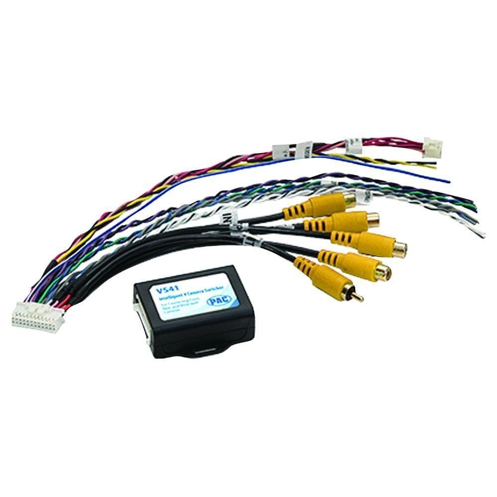 The PAC VS41 Intelligent 4-Camera Switcher is designed to integrate up to four camera inputs with a vehicle's video display. This system enhances driver awareness by automatically activating cameras based on vehicle behavior, such as shifting into reverse or engaging turn signals. It also allows for manual camera selection via a remote control.