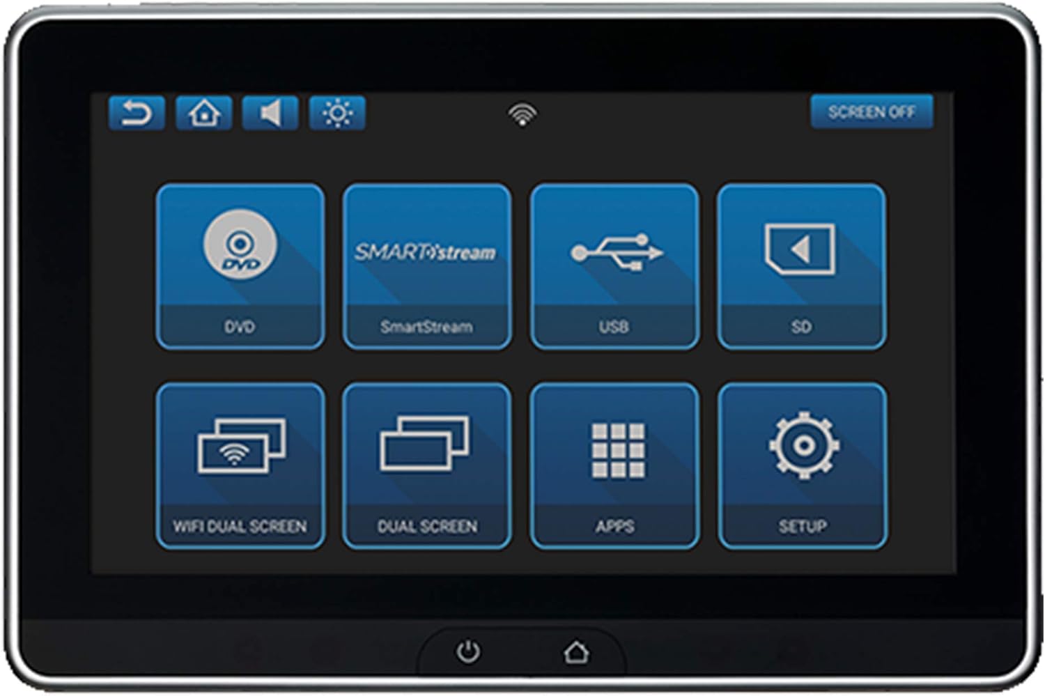 Figure 1: Main interface screen with various input and application options. Icons include HDMI, SmartStream, USB, SD, WiFi Dual Screen, Dual Screen, Apps, and Setup.