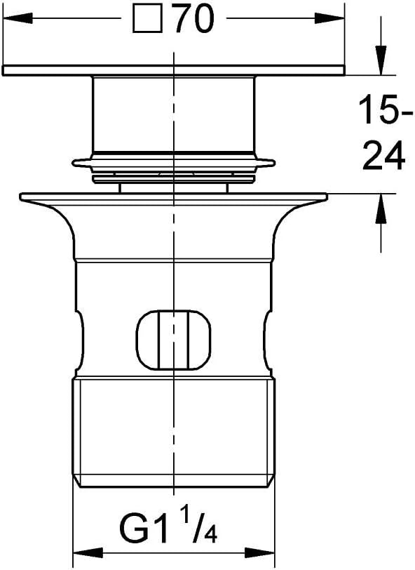 Figure 1: Technical drawing illustrating the GROHE Square Drain Plug with key dimensions. The top square plate measures 70mm, the adjustable height from the sink surface to the top of the plug is between 15-24mm, and the siphon connection is G1 1/4.