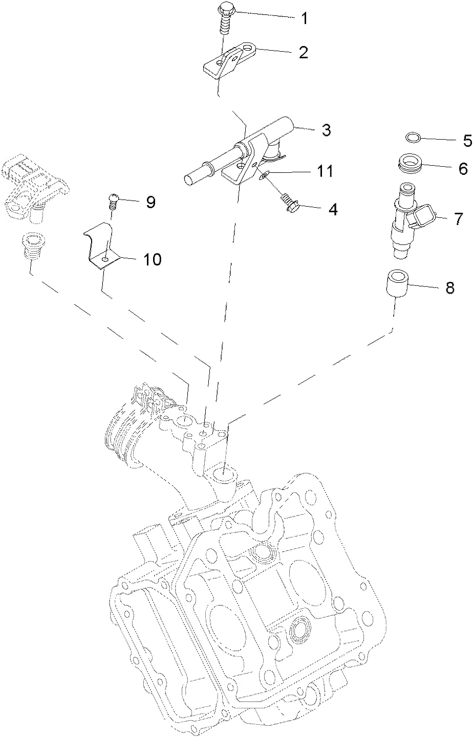 Figura 1: Schematic diagram illustrating the Polaris fuel delivery system. Component 3 represents the fuel delivery pipe, with other associated parts numbered for reference (e.g., 1: screw, 2: clamp, 4: screw, 5: O-ring, 6: washer, 7: injector, 8: cap, 9: screw, 10: bracket, 11: clamp).