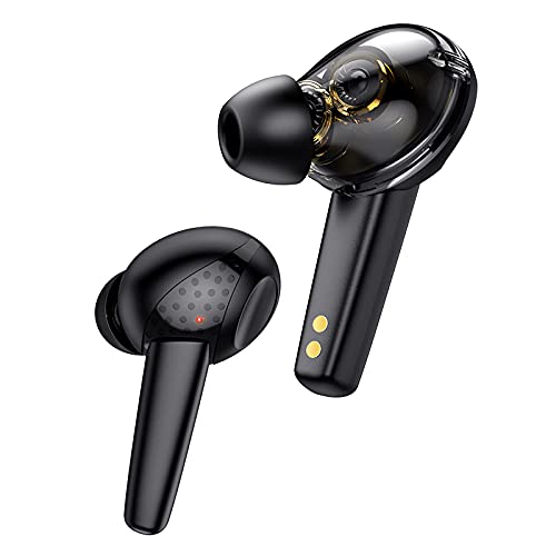 Figura 3.1: The hoco. ES55 Songful TWS Wireless Headset earbuds. These are in-ear style earbuds, black in color, with a transparent section revealing internal components and gold charging contacts at the base of the stem.