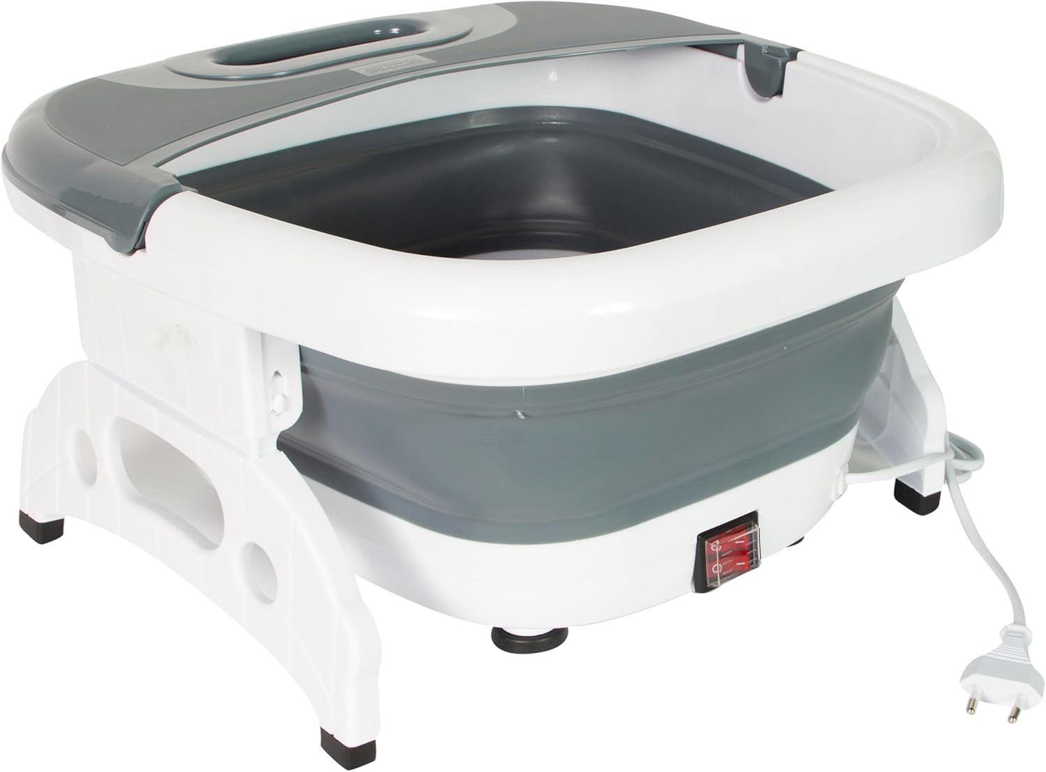 Image: The Silvergear Foldable Foot Spa in its open position, showcasing its compact design and control switch.