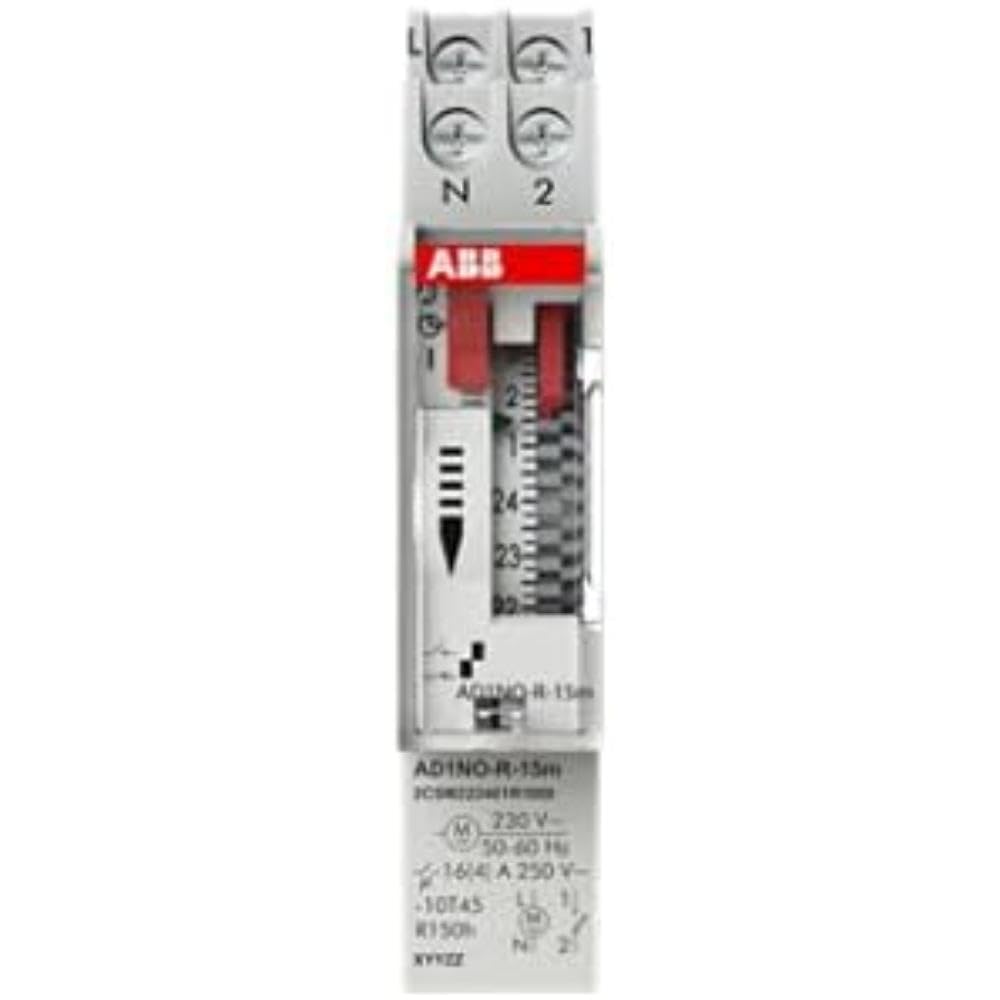 The ABB AD1NO-R-15m is an analog time switch designed for daily scheduling with a 15-minute switching interval. This modular device features one normally open (NO) channel and includes a power reserve function to maintain timekeeping during power outages. It is suitable for various electrical scheduling applications.