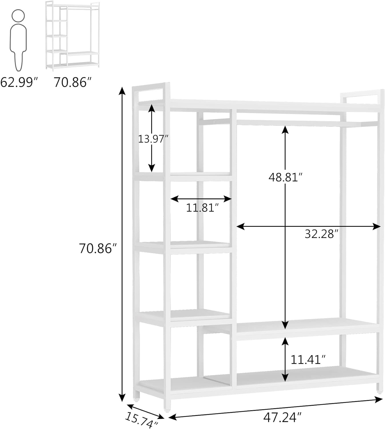 The LITTLE TREE Free Standing Wood Closet Clothes Rack offers a versatile storage solution for various items. Utilize the hanging rods for garments that require hanging, such as shirts, dresses, and coats. The multiple shelves are ideal for folded clothes, shoes, bags, and storage bins.