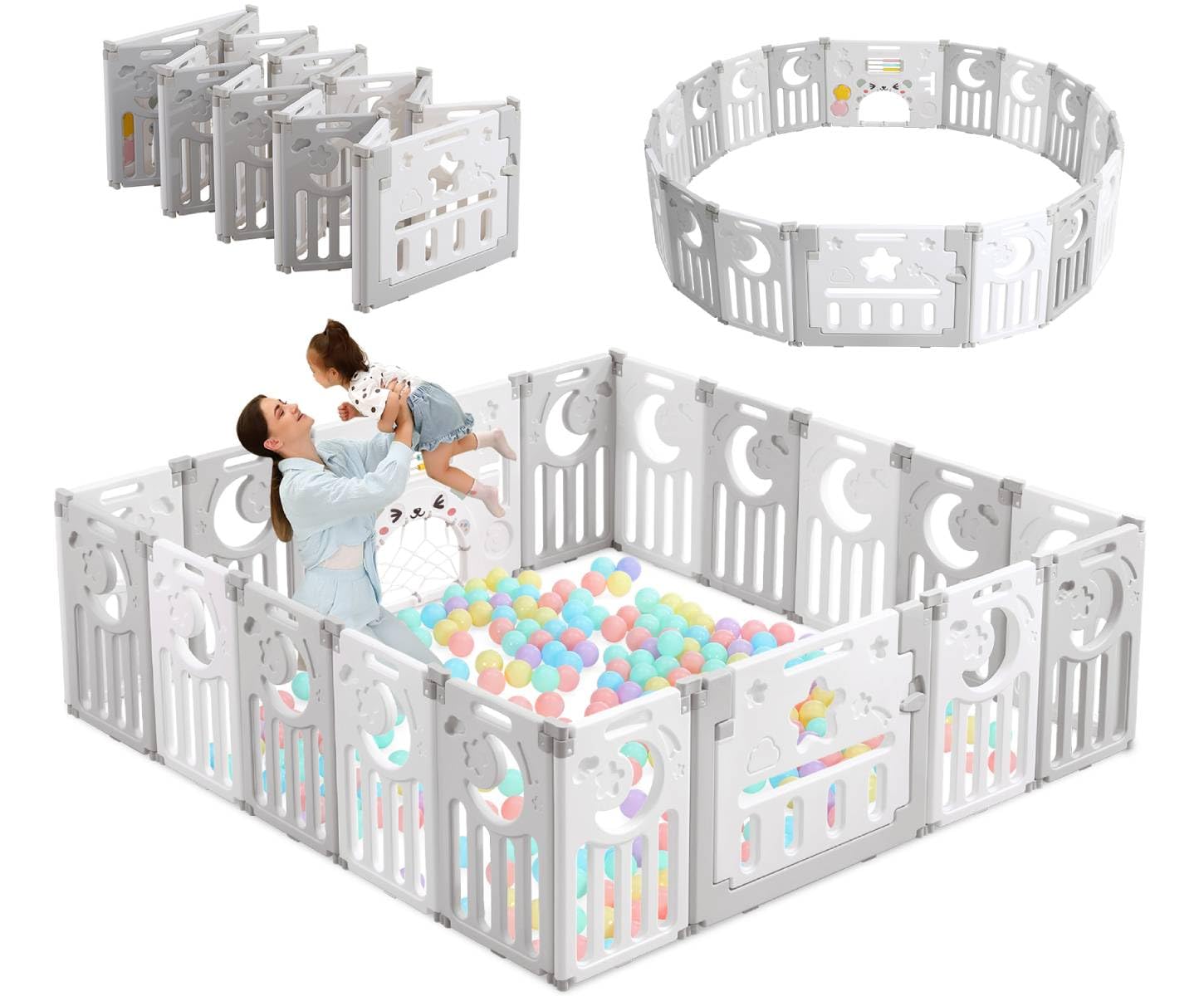 Image: A collage showing the playpen configured in different shapes like a square, rectangle, and octagon, demonstrating its versatility.