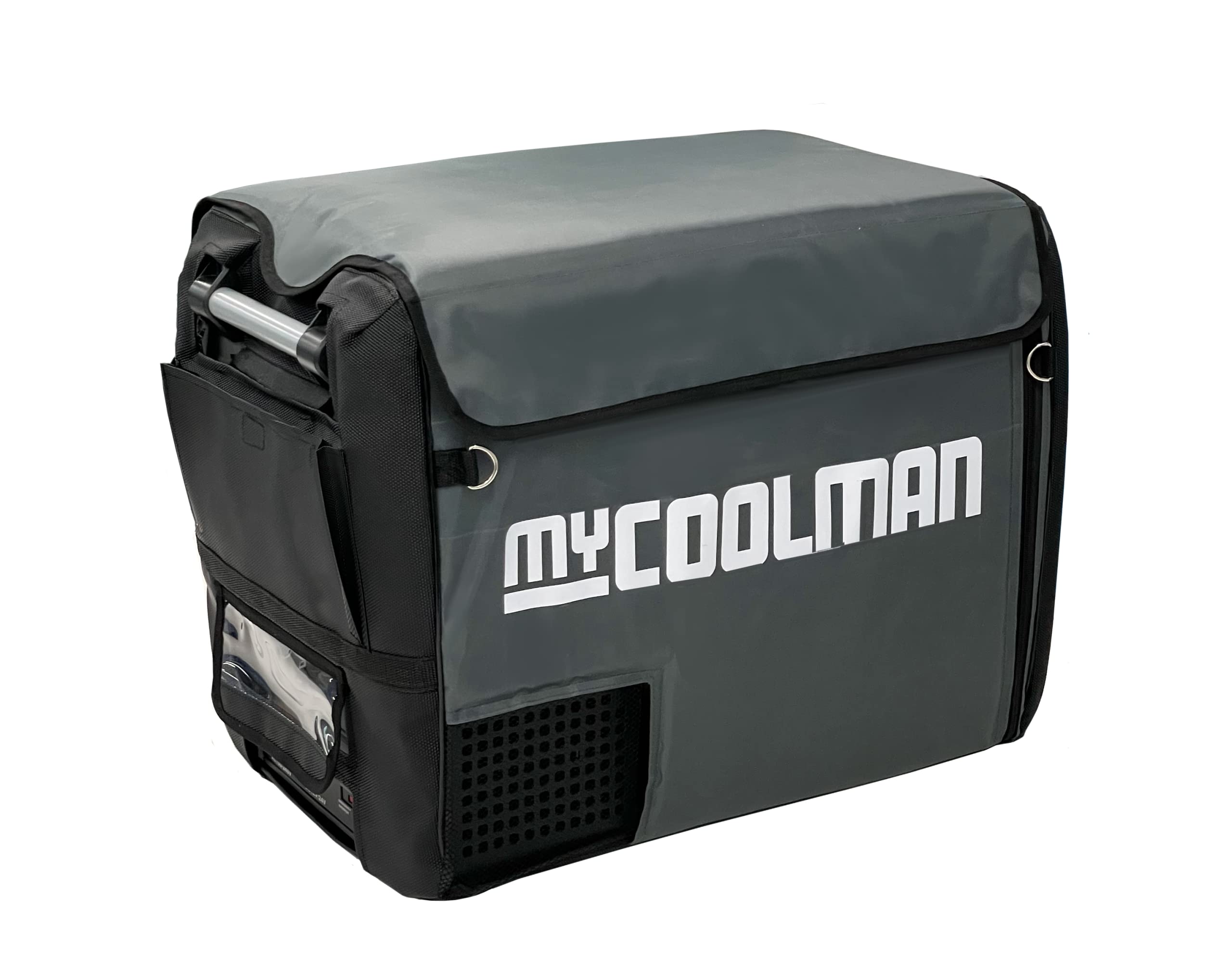 Image showing the myCOOLMAN Milenco The Roamer 47L Compressor Insulated Protective Cover fitted onto a portable refrigerator/freezer unit, highlighting its robust exterior and snug fit.