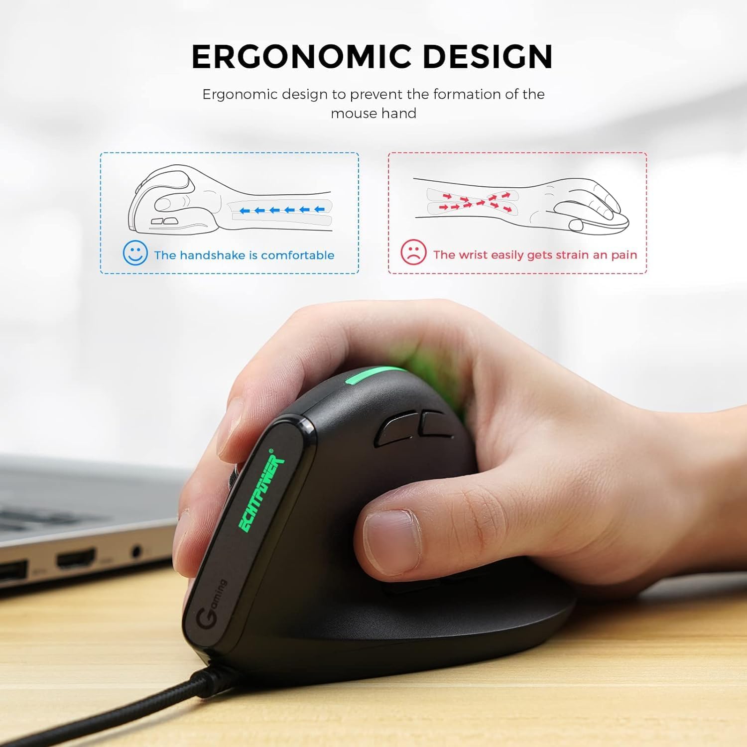 The ECHTPower T-50 is a wired vertical ergonomic mouse designed for right-handed users, aiming to provide a comfortable computing experience and reduce wrist strain. It features 9 programmable buttons, 6 adjustable DPI levels, and customizable RGB lighting, making it suitable for both general use and gaming on PC computers.