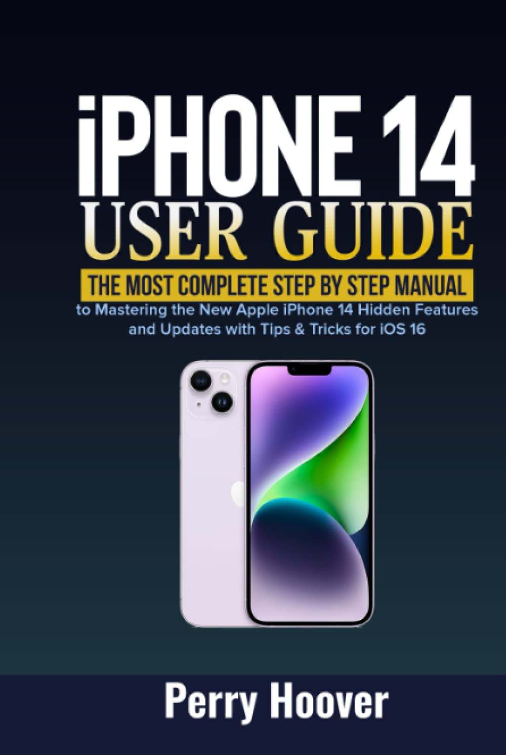 Imatge: Portada del llibre "Guia de l'usuari de l'iPhone 14". Mostra el títol "Guia de l'usuari de l'iPhone 14: el manual pas a pas més complet per dominar les noves funcions i actualitzacions ocultes de l'Apple iPhone 14 amb consells i trucs per a iOS 16" i una il·lustració de dos dispositius iPhone 14, un de color porpra i l'altre de color blanc.