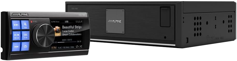 The Alpine HDS-990 Status Series is a high-resolution digital media audio source designed for superior in-car audio experiences. This unit features a compact system control panel and a hide-away black box, offering significant installation flexibility. It is engineered to process and play back Hi-Res Audio files at 192kHz/24bit, meeting the current industry standard for high-fidelity music. The HDS-990 provides versatile connectivity options, including multiple USB ports, RCA outputs, and an optical TOSLINK port, alongside 4x 50Watts hi-resolution amplified speaker outputs, allowing for broad system building flexibility. Its hi-res color display provides clear playback data, including album cover artwork.