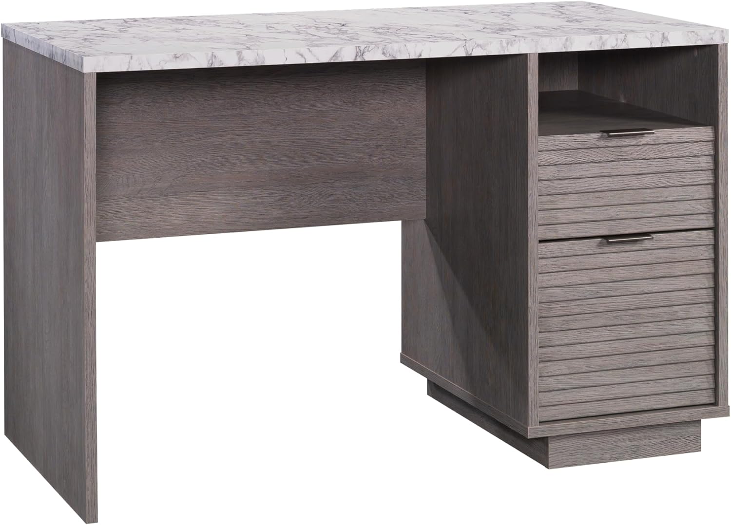 The Sauder East Rock Contemporary Single Pedestal Desk is designed to offer both style and functionality for your home office or study space. This desk features a sleek design with practical storage solutions, including two drawers with full extension slides and an open shelf. The lower drawer is equipped to hold letter or legal-size hanging files, providing organized storage for important documents. The desk is finished on all sides in Ashen Oak with a DuraGraph faux white marble patina top, allowing for versatile placement within any room. Integrated cord management pass-throughs help maintain a tidy workspace by minimizing cable clutter.