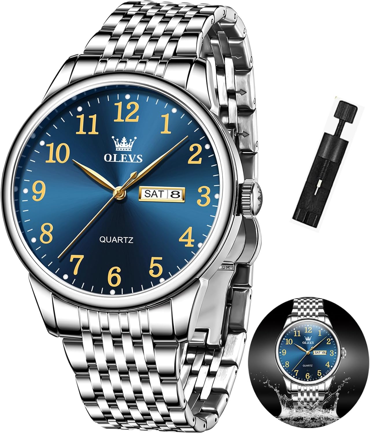 Image: The OLEVS watch with a water splash effect, indicating its 30-meter water resistance rating.
