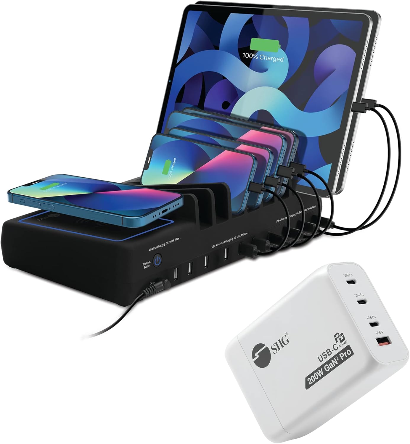 Image: The SIIG 10 Ports Charging Station with its wireless charging deck and the accompanying 200W GaN charger, illustrating its capability to charge multiple devices simultaneously.