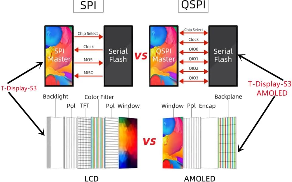 Image: SPI vs QSPI and LCD vs AMOLED comparison.