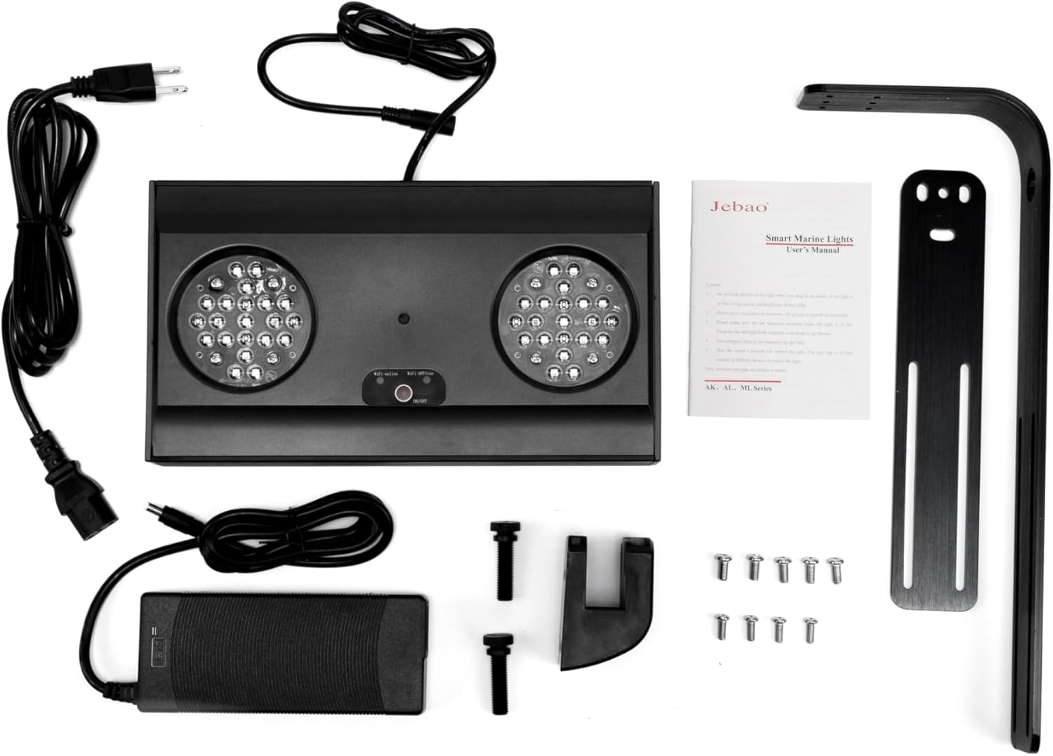 Image: All components included in the Jebao Smart Marine LED Light package, laid out on a white surface. This includes the light fixture, power adapter, mounting arm, and various screws.
