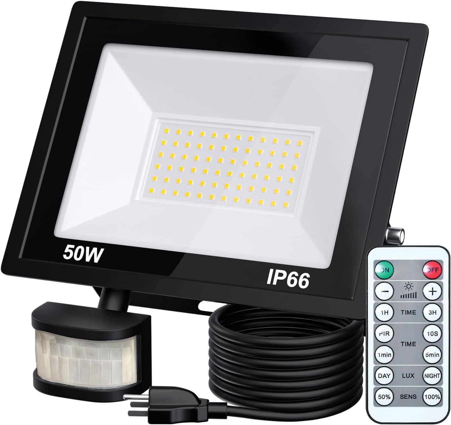 Image 1.1: MIWAT 50W LED Motion Sensor Flood Light with included remote control and power cord.