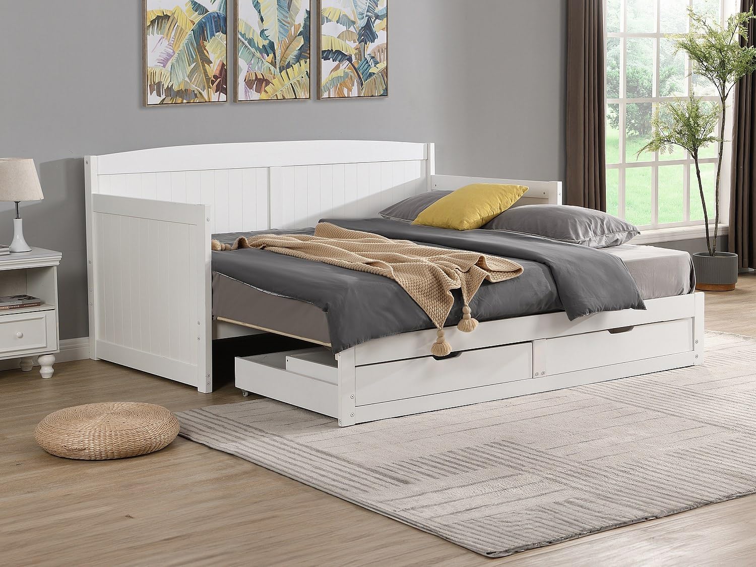 Image: The DINIVA daybed with its trundle bed fully extended, revealing the additional slatted sleeping surface and the two storage drawers beneath the main bed.