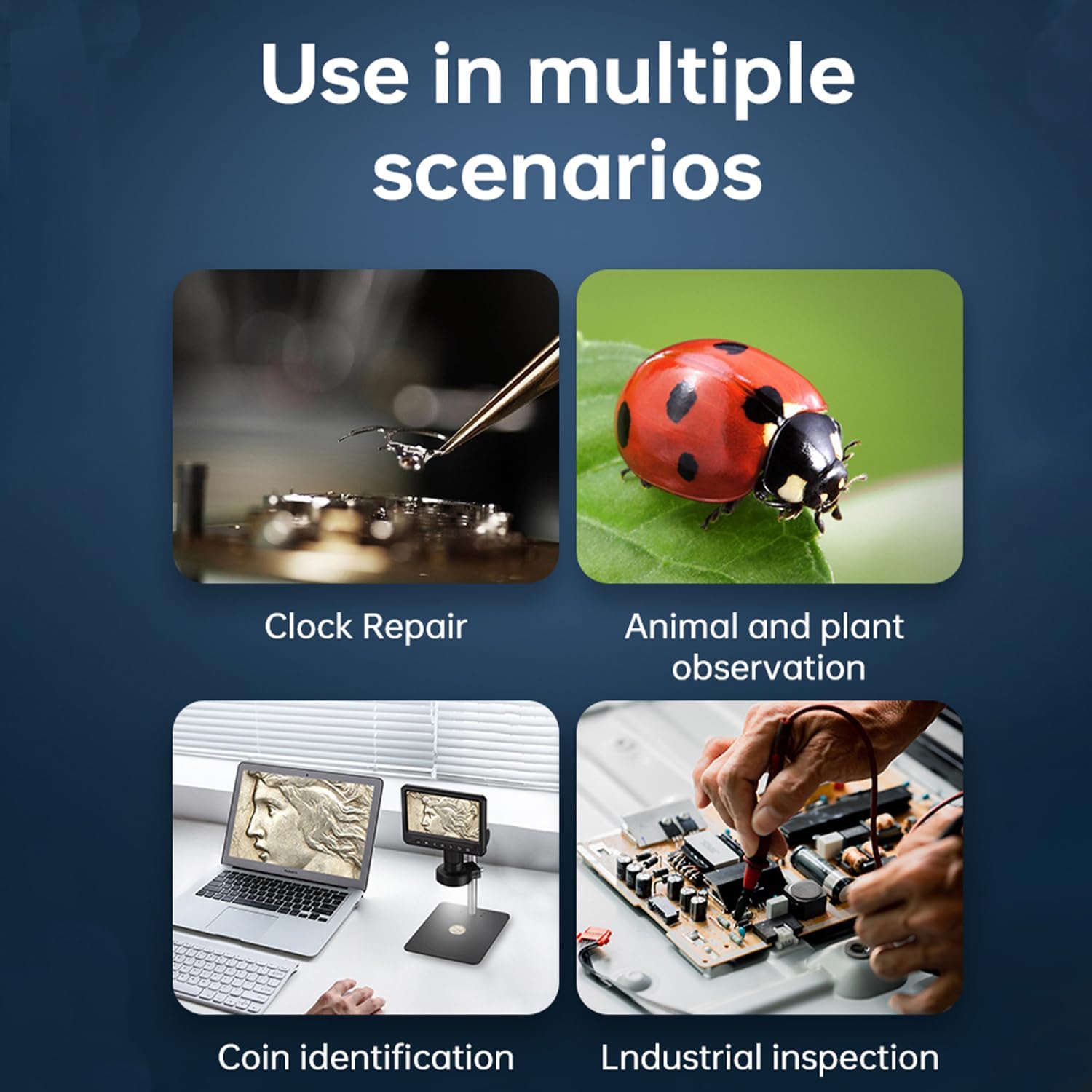 Figura 1: The AOPICK digital microscope is versatile, suitable for applications such as clock repair, observing plants and animals, coin identification, and industrial inspection.