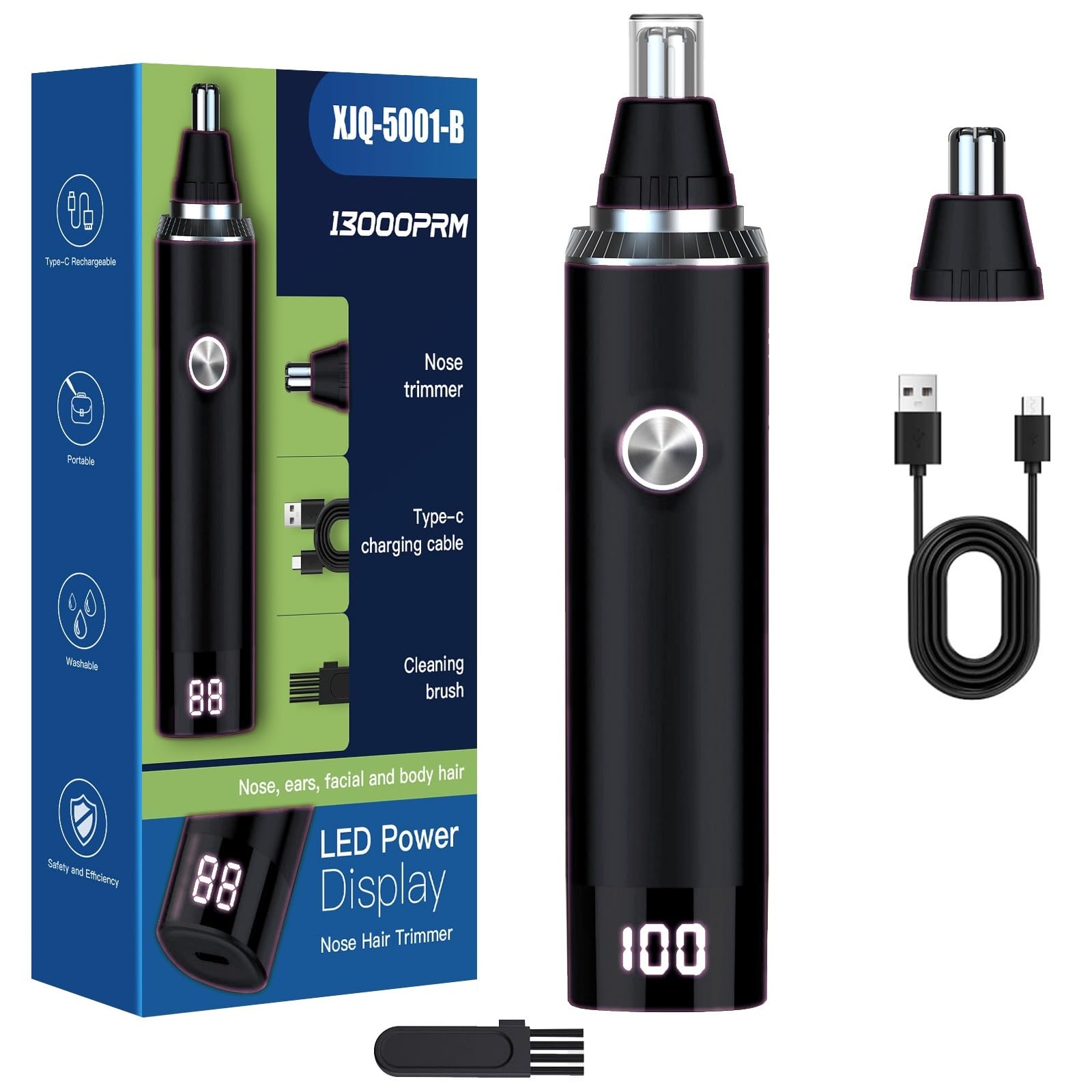 The Ginity XJQ-5001 is a versatile, USB rechargeable hair trimmer designed for nose, ear, eyebrow, and facial hair. It features an LED display for battery status and interchangeable heads.