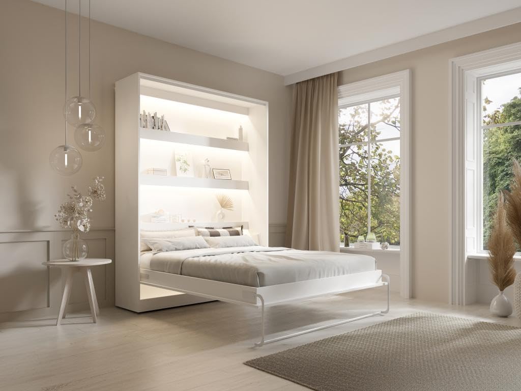 When closed, the RAPILI bed appears as a sleek cabinet. With a simple manual vertical opening mechanism, it transforms into a fully functional bed, providing the comfort of a traditional bed. It features integrated LED lighting and shelves above the bed, offering convenient storage and a relaxing ambiance.
