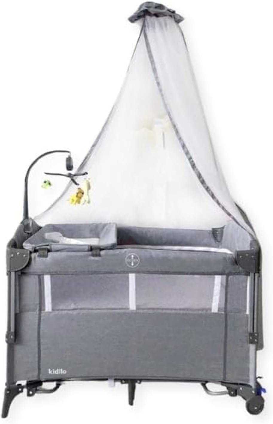 The Kidilo Baby Bed P02 is a versatile infant bed designed for comfort and convenience, functioning as both a standalone baby bed and a co-sleeper. It features a side-folding mechanism, soothing cradle movement, a removable changing bed, and integrated wheels for easy mobility. The bed includes a musical pendant and a mosquito net for enhanced functionality. It offers two separate floor levels, allowing use as a sleeping bed for infants up to two years old and as a playard for children up to three to four years old.