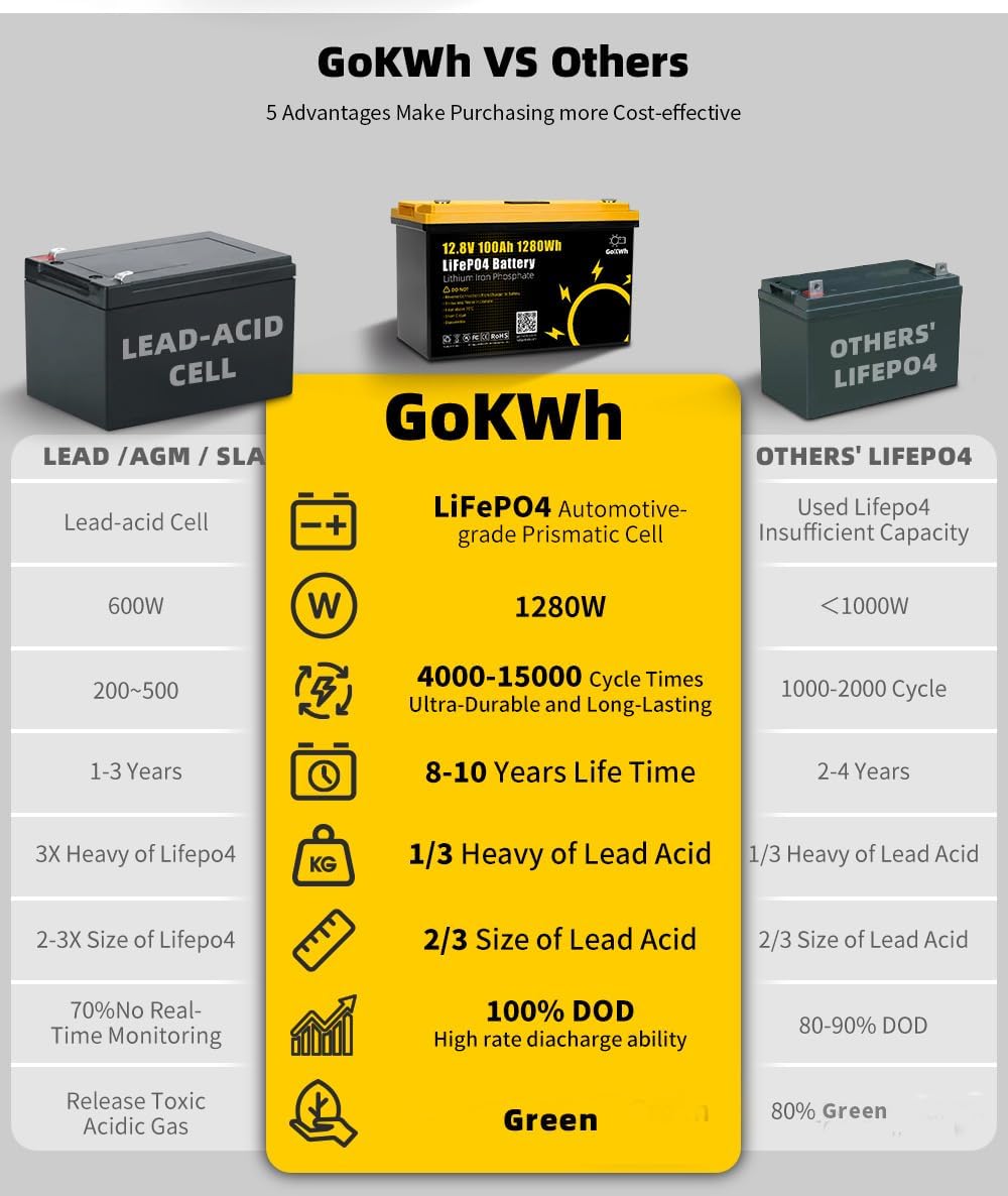 Descripció de la imatge: A comparison chart highlighting 5 advantages of GoKWh LiFePO4 batteries over traditional lead-acid cells and other LiFePO4 batteries. Advantages include higher power (1280W vs 600W/<1000W), longer cycle times (4000-15000 vs 200-500/1000-2000), longer lifespan (8-10 years vs 1-3 years/2-4 years), lighter weight (1/3 of lead acid), smaller size (2/3 of lead acid), 100% DOD, and being green.