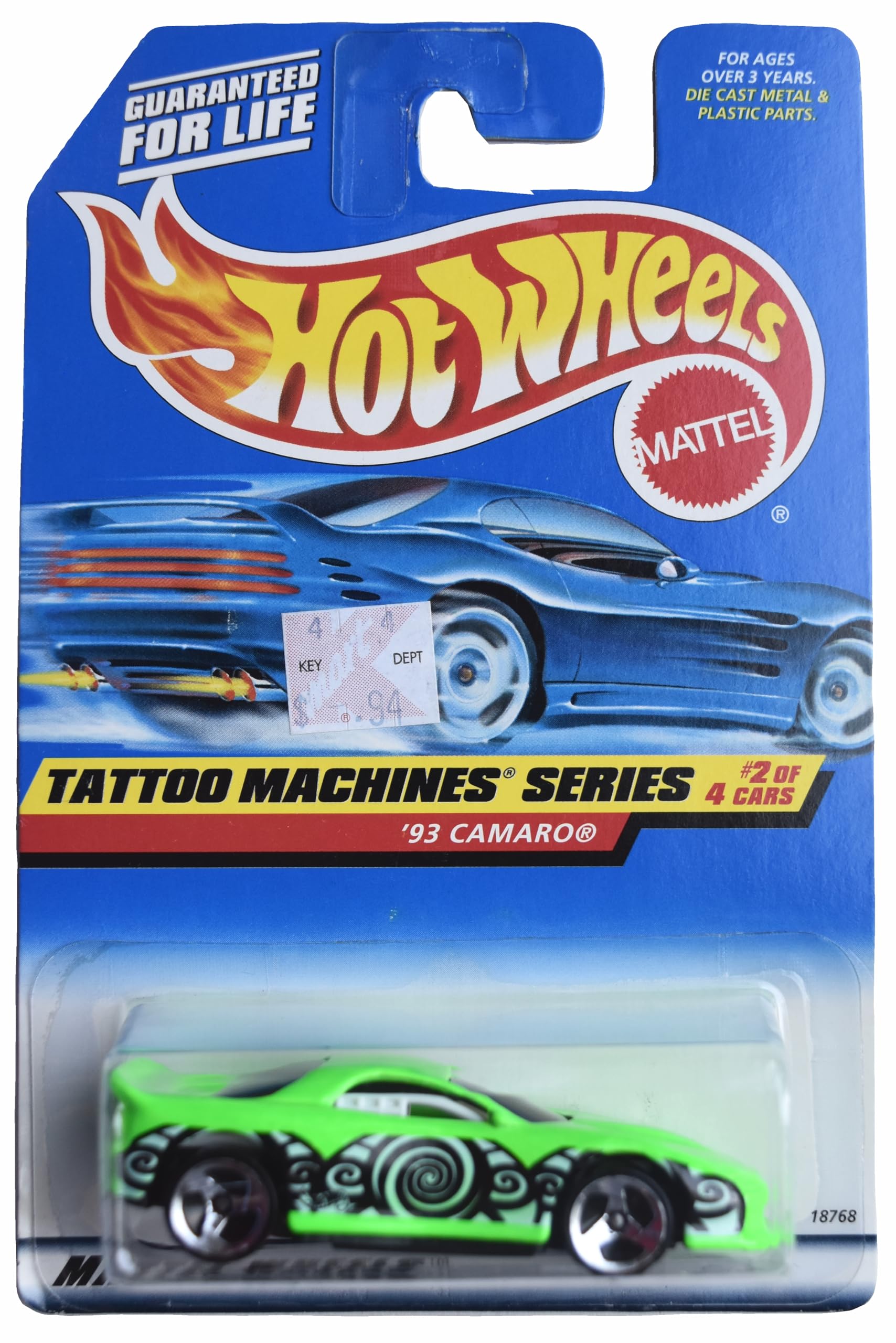 The Hot Wheels '93 Camaro is a highly detailed 1:64 scale die-cast replica. It features a unique design from the Tattoo Machines Series, showcasing intricate graphics and a vibrant finish. This model is crafted with precision to replicate the iconic '93 Camaro.