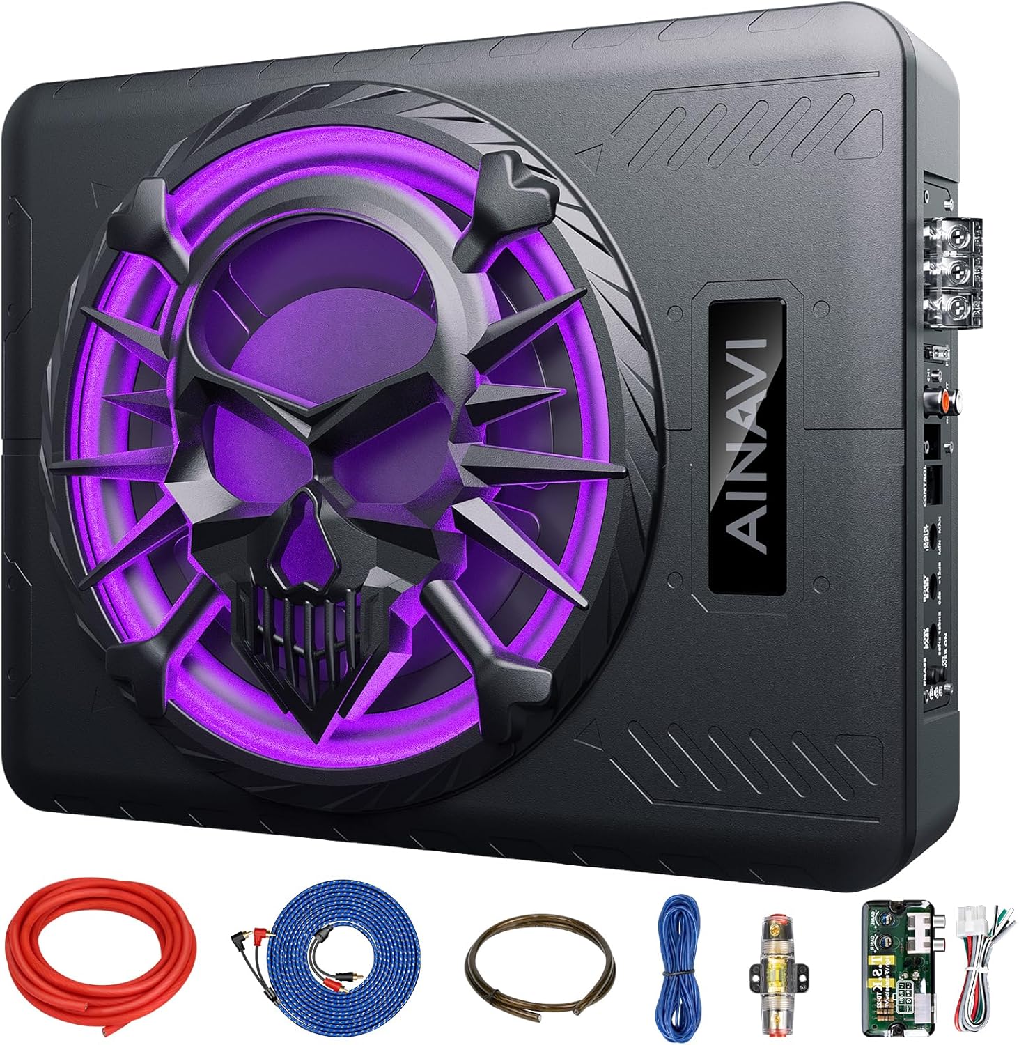Video: This video demonstrates the compact design of the AINAVI 10" car subwoofer, highlighting its ability to fit under a car seat or in the trunk, and showcasing its powerful bass output and colorful LED ambient lighting features.