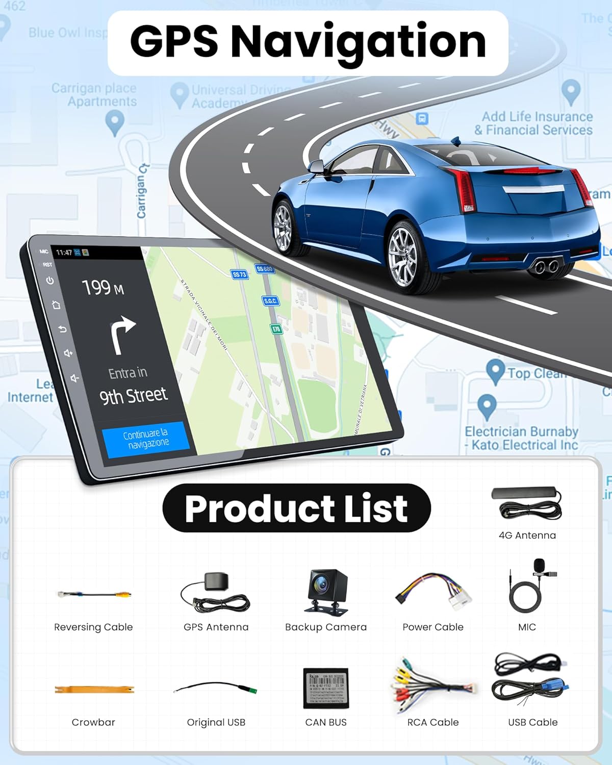 The unit includes built-in offline maps and supports GPS/GLONASS/BeiDou tri-band for precise positioning. Real-time updates are available via 5G WiFi, compatible with popular navigation apps like Waze and Google Maps.