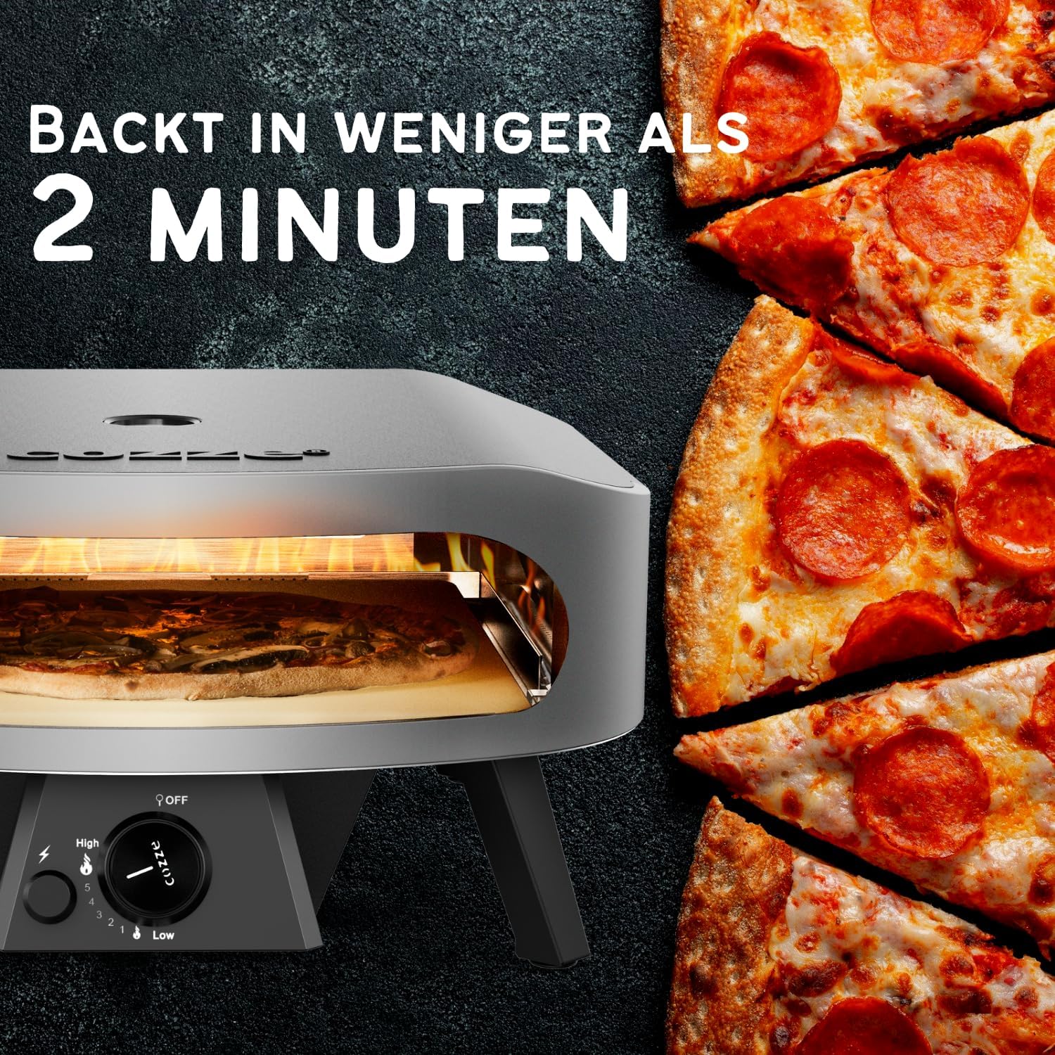 Image: The cozze 17-inch Gas Pizza Oven in operation, with a pizza cooking inside and flames visible. This illustrates the rapid cooking capability.