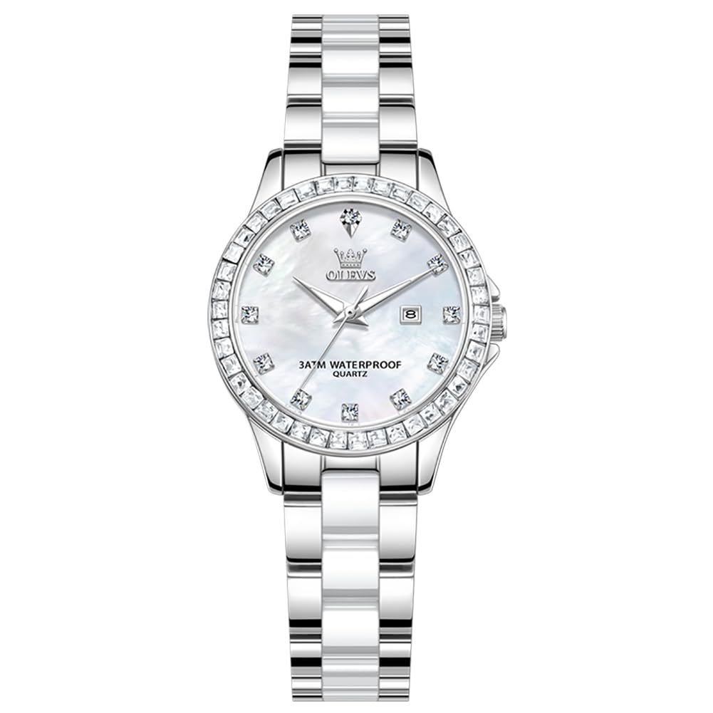 Image: OLEVS G6012 Women's Diamond Watch, showcasing its elegant design with a white band and white dial.