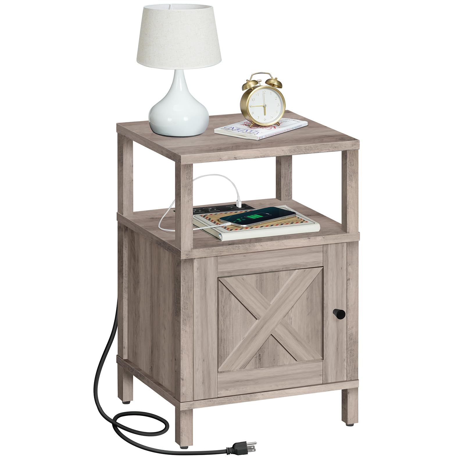 Image 1.1: The MAHANCRIS Farmhouse Nightstand with Charging Station, showcasing el seu disseny i funcionalitat.