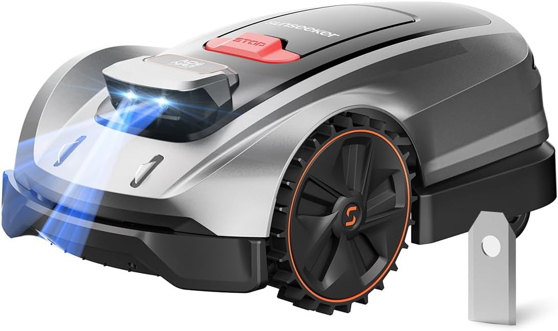 Figura 1.1: Sunseeker X3 Plus Robot Lawn Mower. This image shows the sleek, grey and black robotic lawn mower with orange accents on its wheels, featuring a red stop button on top and blue lights emanating from its front sensors.