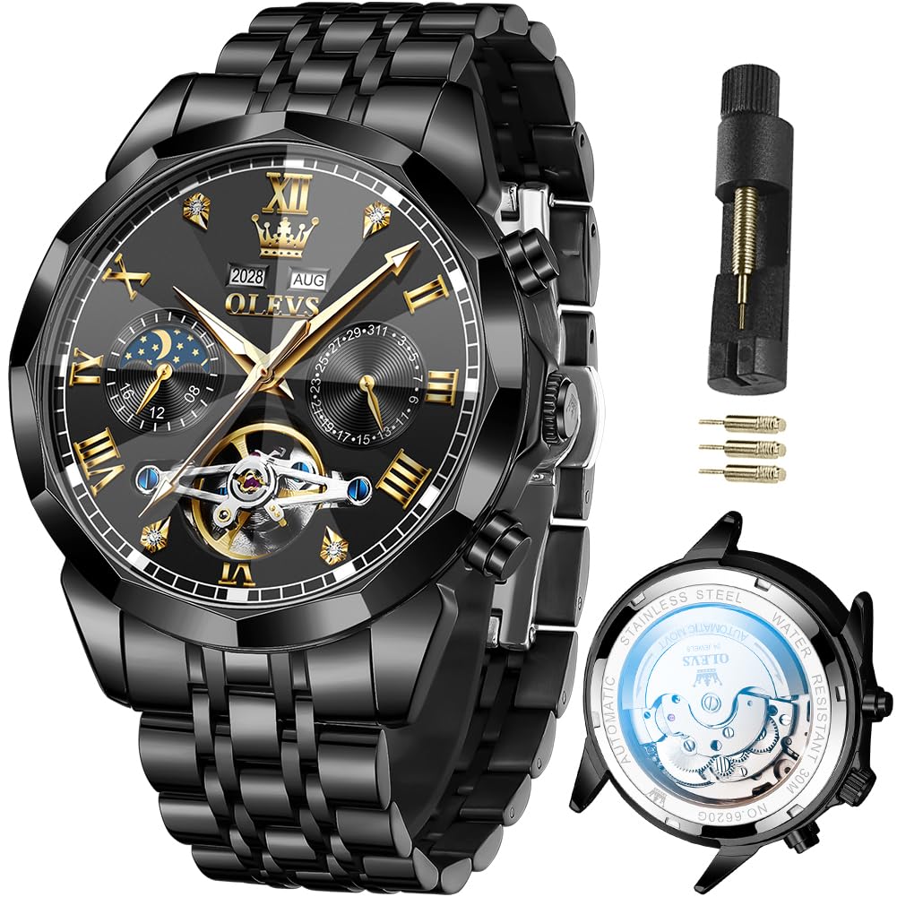 Imatge 1: Frontal view of the OLEVS Automatic Mechanical Watch Model WD-S-G6620G-HH, showcasing its black stainless steel band, black skeleton dial with gold accents, and luminous markers.